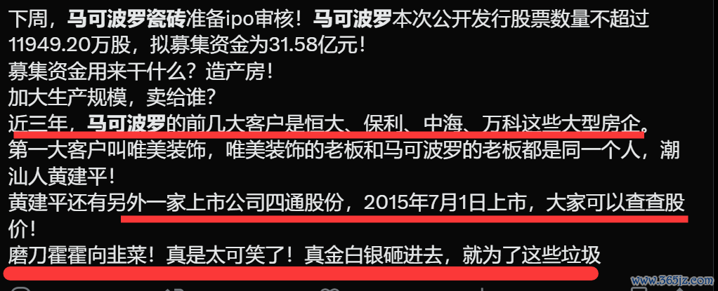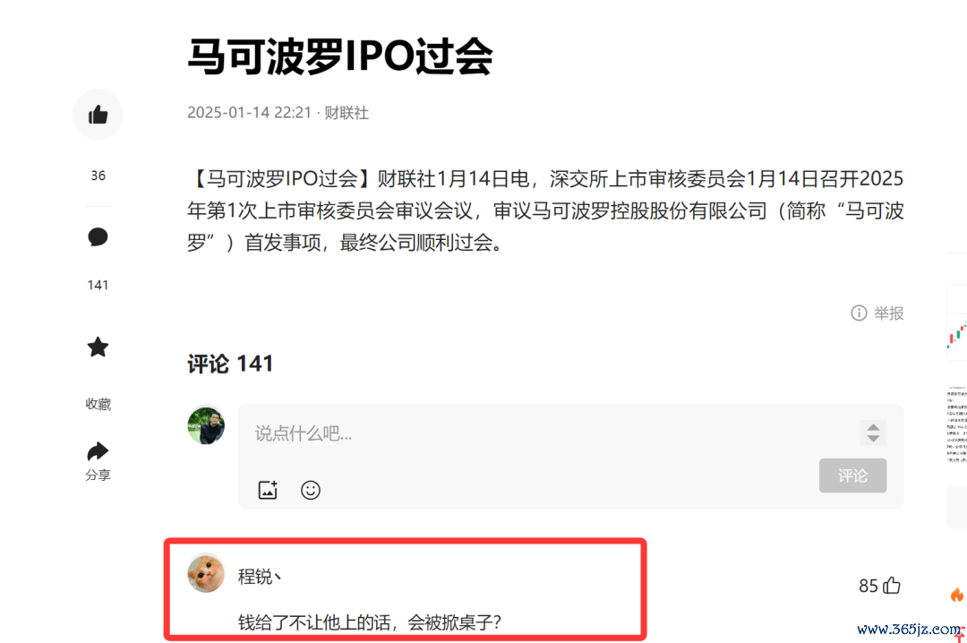 事实上,马可波罗的问题并非无迹可寻。深交所曾就应收账款、坏账转回、高毛利率等问题发出问询函,市集也屡次质疑其募资必要性(账上趴着 38.88 亿元货币资金,却募资 23.77 亿元),但这些质疑最终都未退却其过会。这不禁让东说念主追问:监管层在审核时,是否充分有筹商了公司的合手续盈利智商?是否穿透核查了干系往还的真实性?是否着实保护了中小投资者的利益?照旧说,有钱能使鬼推磨?有网友暗示,“若不让过会,波罗公司会立地让贿赂事宜走漏,年前审核委员立即会被双规。若让波罗过会,审核委员只少不错寂静过完年,在立地坐牢照旧过完年后坐牢之间遴荐了过完年后再坐牢。”