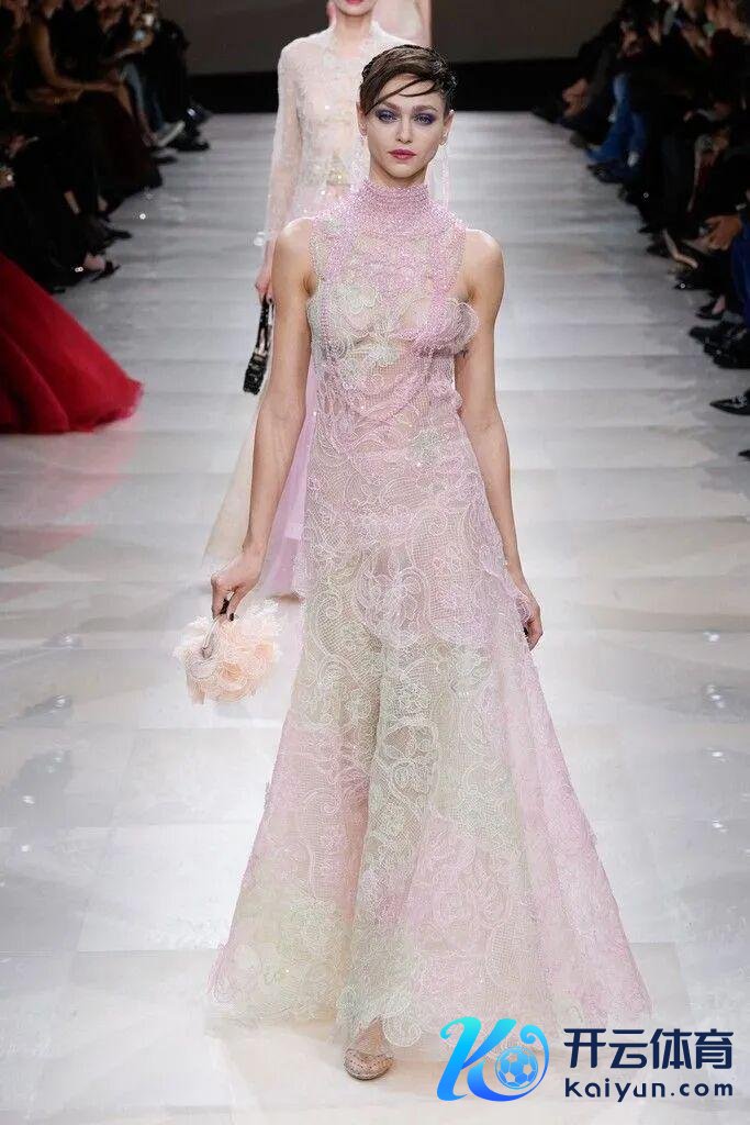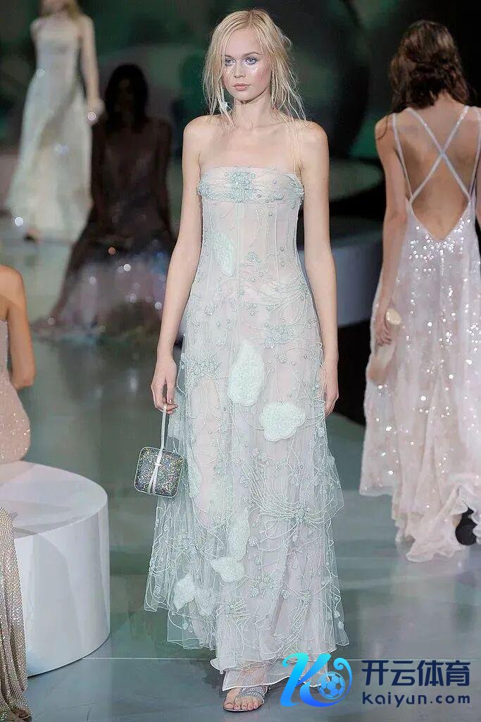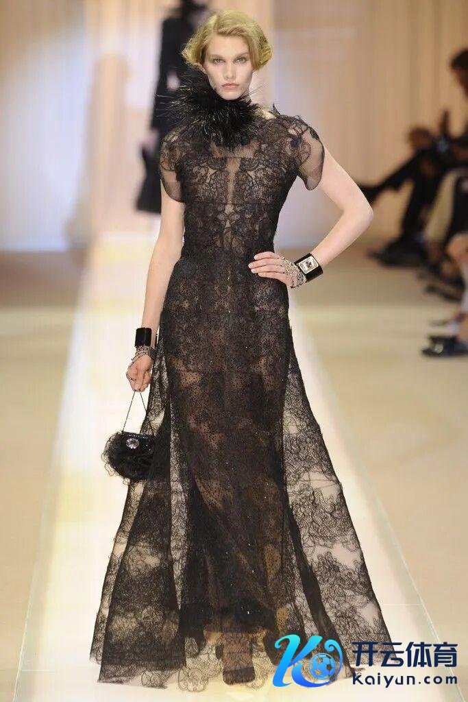 Giorgio Armani 的审好意思一以贯之,他的蕾丝常常大面积袒护,成为战胜的主体,或在罩衫与长裙中呈现出令东谈主屏息的静好意思。